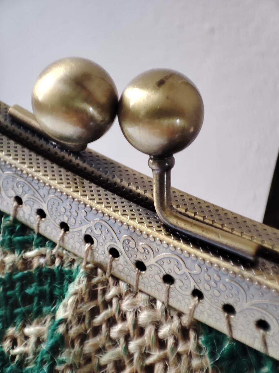 È stata creata con un vero sacco usato per il trasporto di caffè brasiliano. ( Ho trovato dentro ancora alcuni chicchi!). La chiusura a clic clac, con apertura in metallo brunito, di ottima qualità, ha un'apertura di 27 cm ( quindi pratica e spaziosa), ed è cucita a mano. Il manico di bambù è bello ampio e di comoda presa. I nodi, che sono stati lasciati a vista per estetica, facilitano l'impugnatura. L'anima interna è in tessuto rigido, indeformabile, impermeabile ed è stata " incatenata" al tessuto di juta per mentenere la forma bombata.